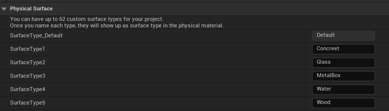 Go to your project settings and define a list of custom physical surface types (e.g., “Concrete,” “Glass,” “Water”).