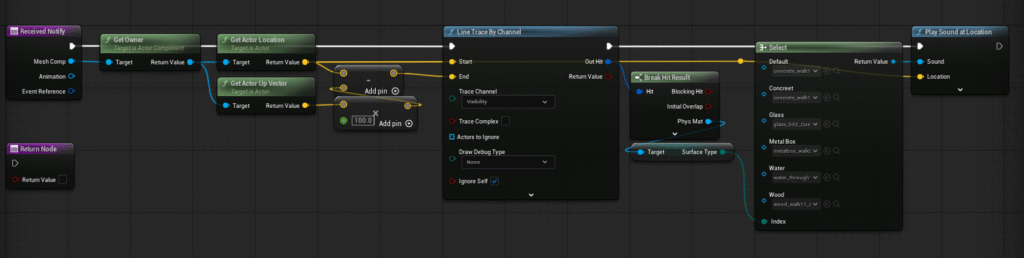 - Use a “Select” node to choose a sound based on the identified surface type.