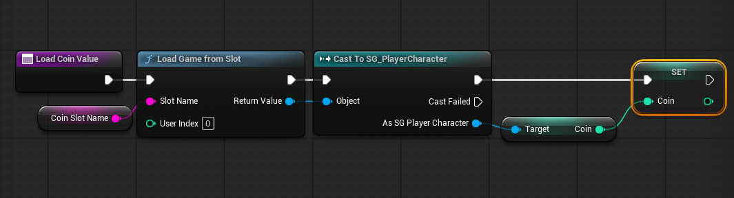 - Does Save Game Exist(“PlayerSave”,0)? → if true: Load Game from Slot → cast to