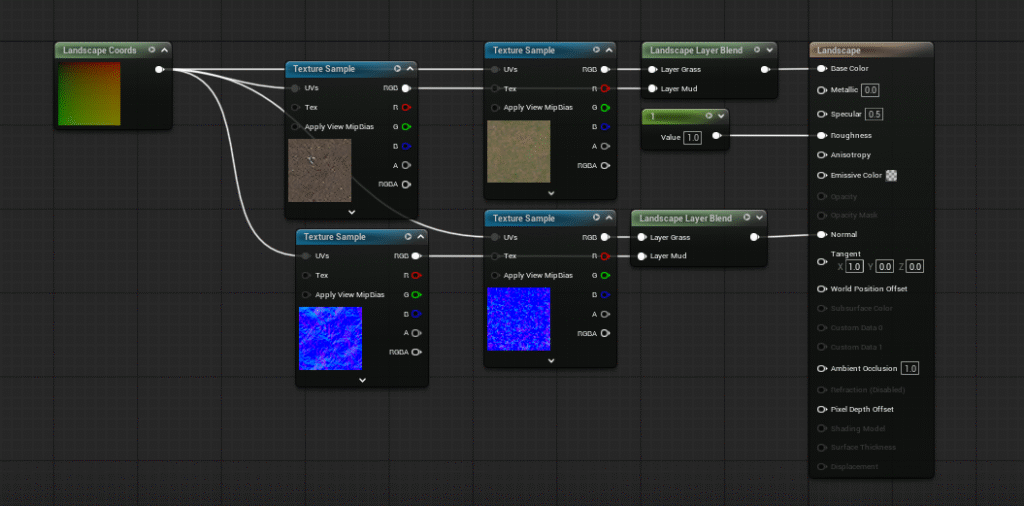 - Add a LandscapeCoords node to control tiling (Start with Mapping Scale ~0.2–0.5; adjust later).