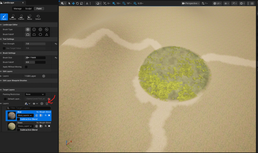 - Paint on the terrain. Use low Tool Strength (0.1–0.3) for natural blends.